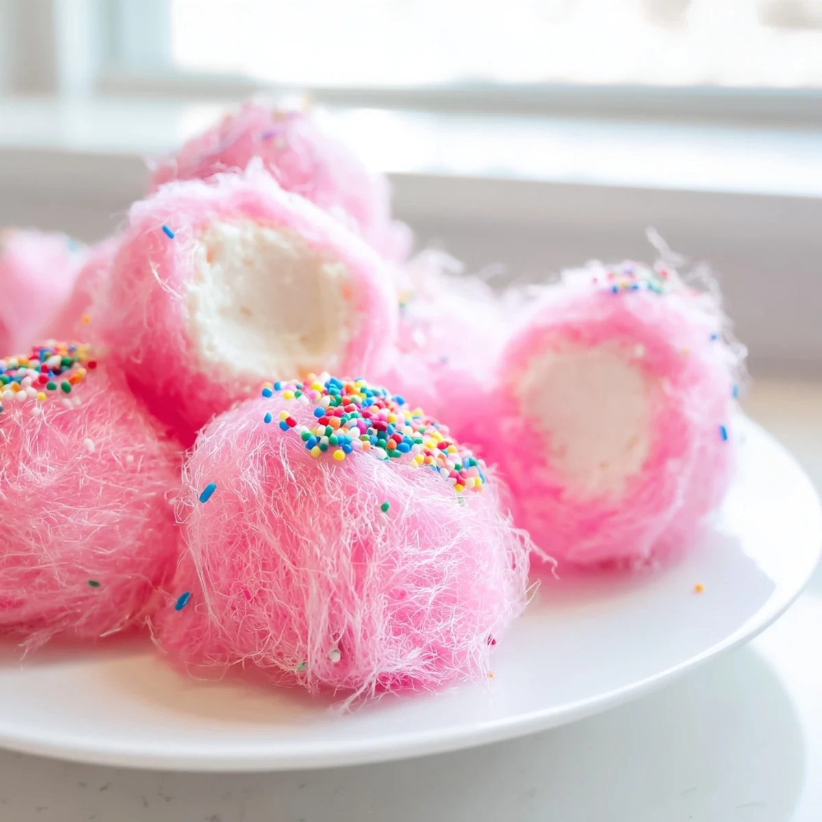 These whimsical bite-sized treats feature creamy homemade cheesecake centers made with cream cheese, sugar, vanilla, and heavy cream, frozen until firm, then gently wrapped in fluffy cotton candy.