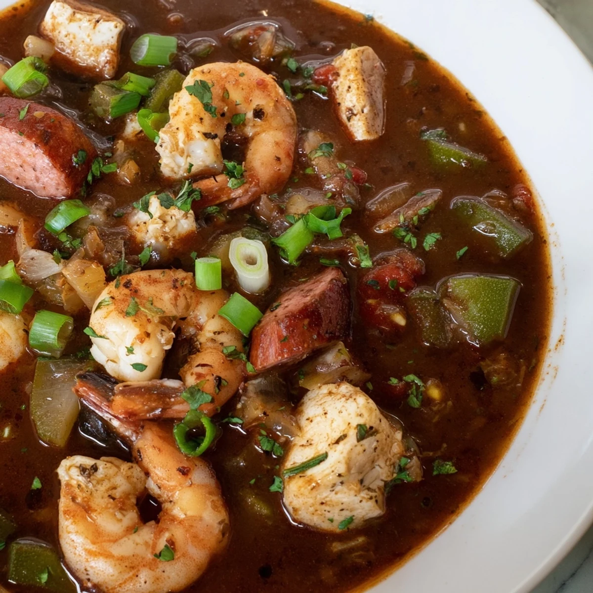This Creole seafood gumbo blends tender shrimp, lump crabmeat, and firm white fish with smoky andouille sausage and fresh sliced okra. A dark chocolate roux forms the base, enriched with diced tomatoes, bell pepper, celery, and Creole seasonings. Simmered slowly to meld flavors, the hearty broth carries hints of thyme, cayenne, and Worcestershire sauce. Served hot over white rice and garnished with green onions and parsley, it delivers a soulful taste of Louisiana with a perfect balance of spice and depth.