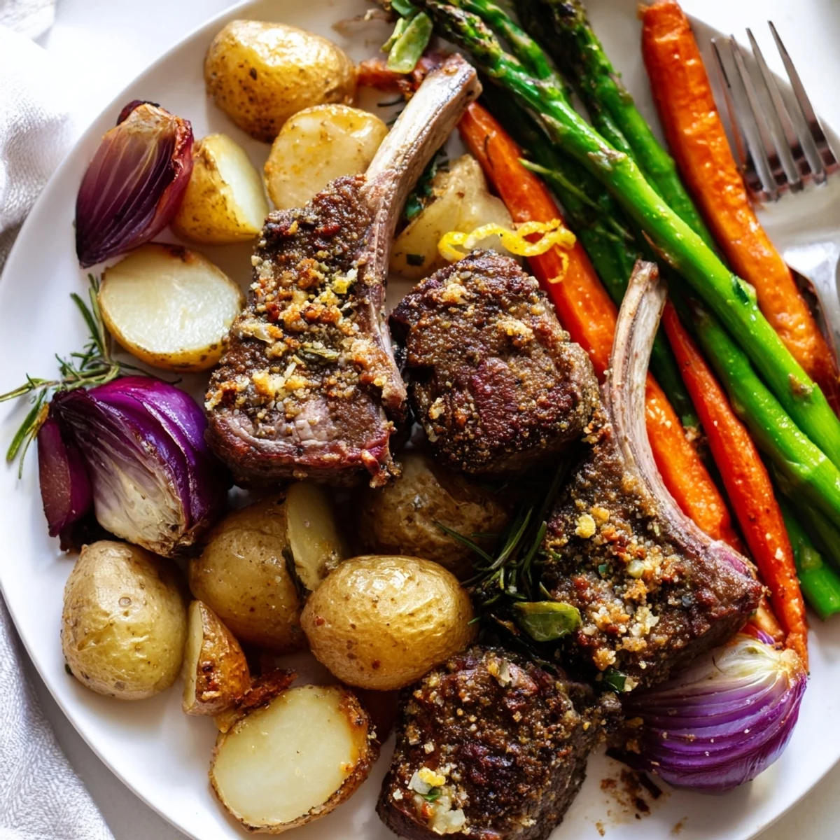 This festive Easter meal brings together herb-crusted lamb chops with baby potatoes, carrots, asparagus, and red onion. Everything roasts together on a single sheet pan at 425°F, allowing the vegetables to caramelize while the lamb develops a beautiful crust. Fresh rosemary, thyme, garlic, and lemon infuse the entire dish with bright, aromatic flavors that celebrate spring.