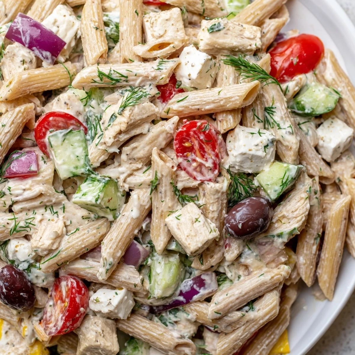 This satisfying Greek-inspired salad combines whole wheat pasta with tender chicken breast, creamy reduced-fat feta, and crisp vegetables including cucumber, cherry tomatoes, red onion, and bell pepper. The tangy dressing features Greek yogurt, olive oil, lemon juice, and oregano for authentic Mediterranean flavor. Ready in just 25 minutes, it keeps well for days and serves four generously.