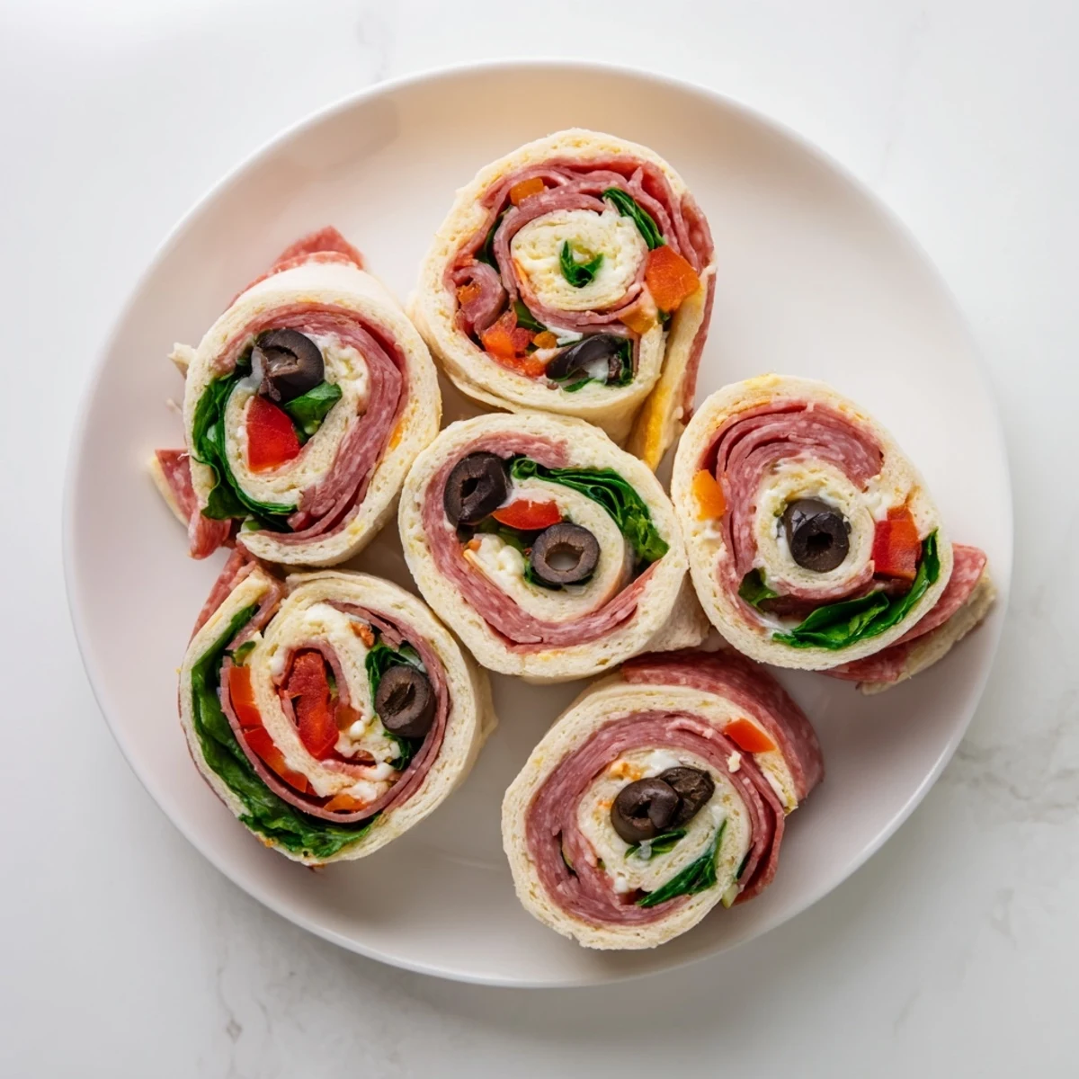 These colorful Italian pinwheel sandwiches combine layers of Genoa salami, pepperoni, and ham with provolone cheese, fresh spinach, roasted red peppers, and black olives. The creamy spread blends softened cream cheese with mayonnaise, Italian seasoning, and garlic powder for extra flavor. Each tortilla gets tightly rolled and chilled before slicing into beautiful spirals that reveal the vibrant filling inside.